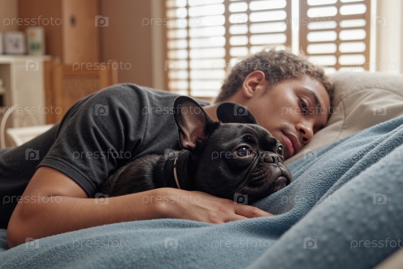 Молодой взрослый чернокожий мужчина лежит в постели обнимает французского бульдога утром