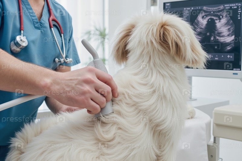 Ветеринар, выполняющий ультразвуковое обследование собаки в современной клинике