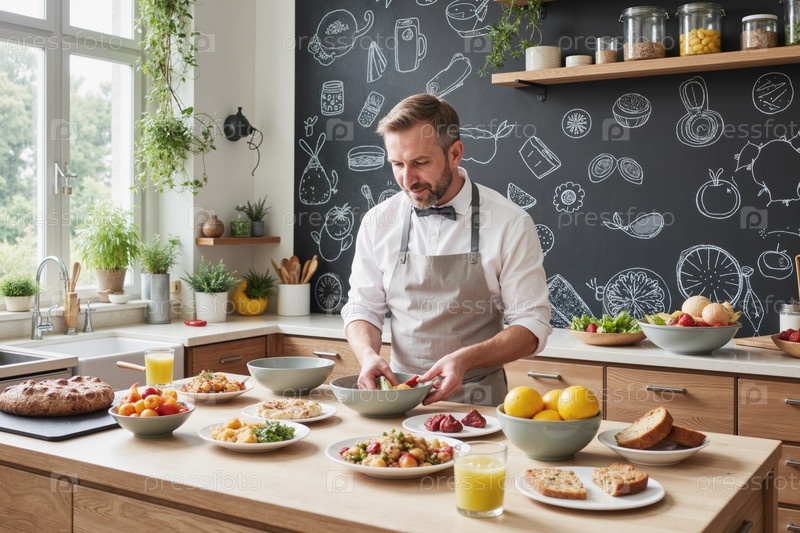 Мужчина средних лет готовит здоровые блюда на современной кухне