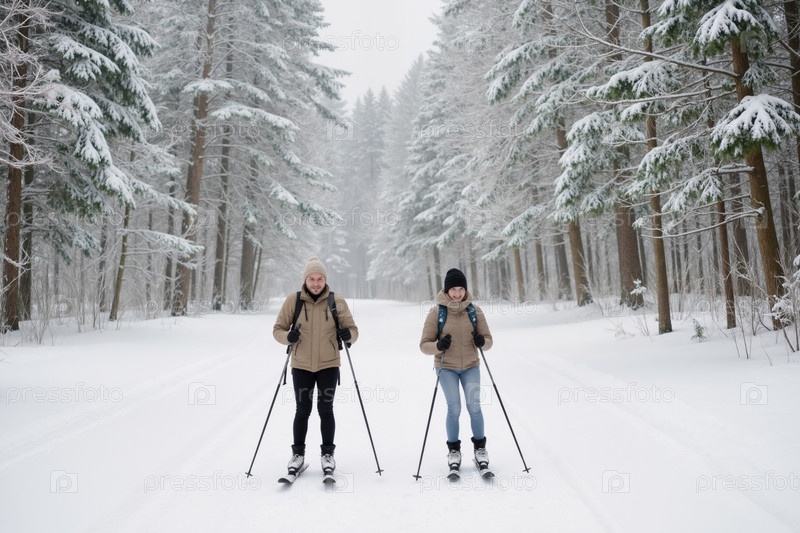 Молодой мужчина и женщина вместе катаются на лыжах по снежному зимнему лесу