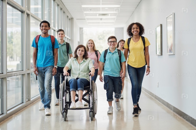Разнообразная группа подростков ходят по школьному коридору с девочкой-инвалидом