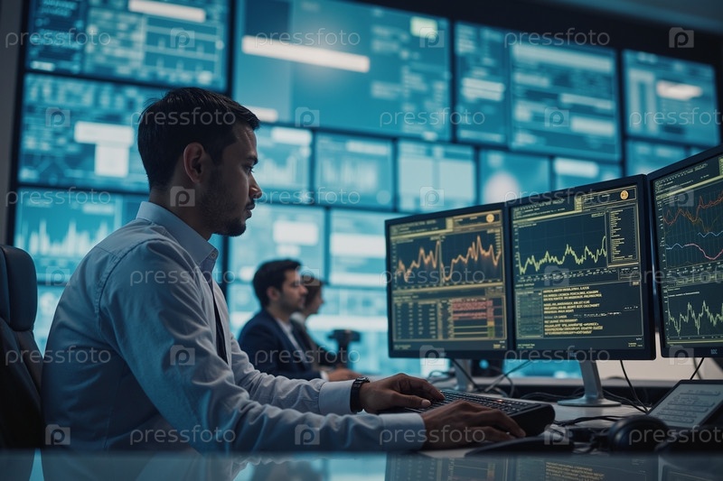 Молодой взрослый мужчина отслеживает финансовые данные на нескольких экранах компьютера