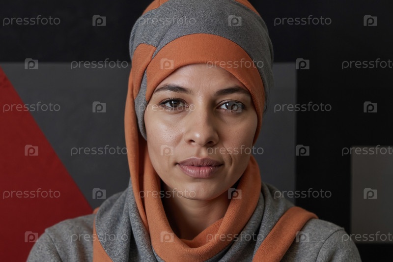 Портрет молодой взрослой женщины с Ближнего Востока, которая носит платок и выглядит уверенно