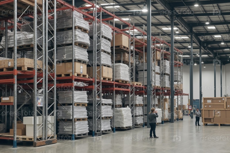 Человек среднего возраста, курирующий инвентарь в большом промышленном складе