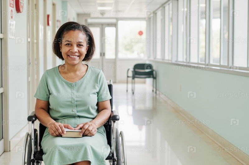 Портрет чернокожей женщины среднего возраста с инвалидностью, улыбающейся в инвалидном кресле