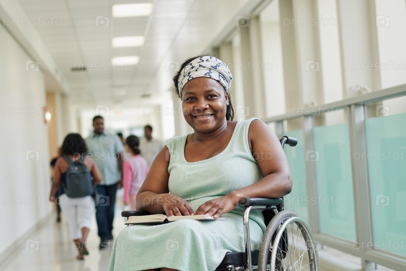 Портрет чернокожей женщины среднего возраста в инвалидном кресле, улыбающейся на коридоре больницы
