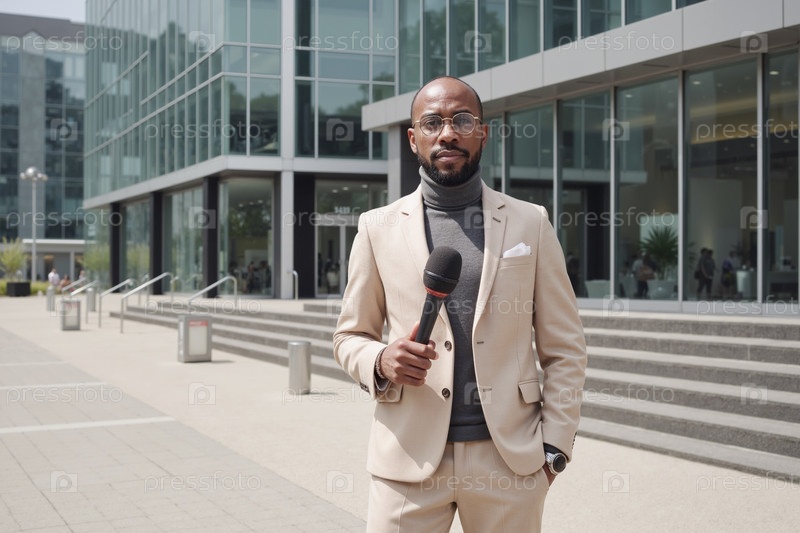 Молодой взрослый чернокожий человек сообщает новости за пределами современного офисного здания