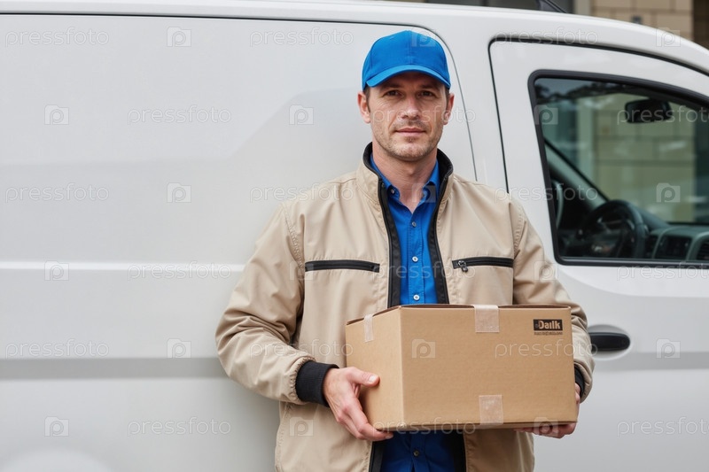 Молодой взрослый мужчина, доставляющий посылку, стоит перед фургоном для доставки