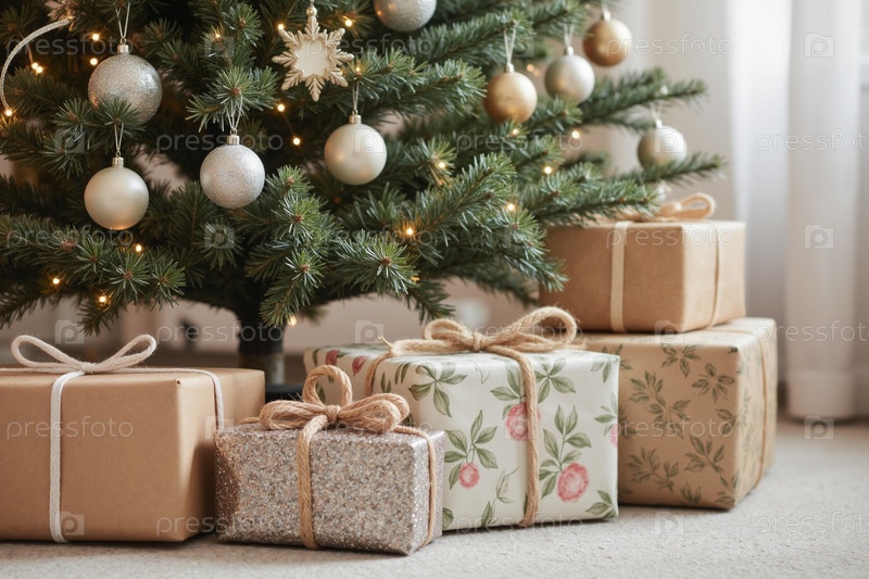 Рождественская елка с упакованными подарками, расположенными под ней в праздничной обстановке