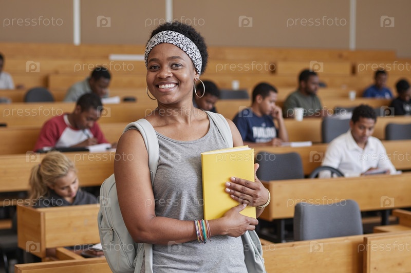 Молодая взрослая чернокожая женщина улыбается, держа записную книжку в университетском лекционном зале