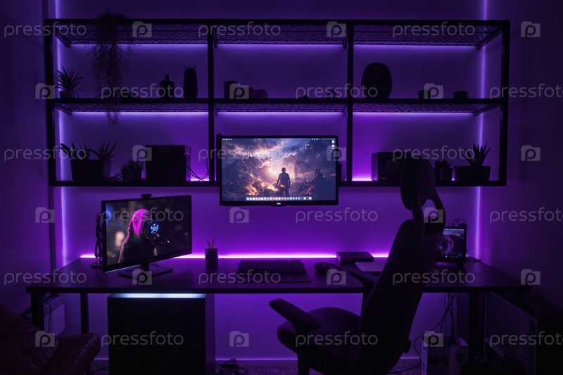 Современная игровая установка с двойными мониторами, освещающая темную комнату неоновыми огнями