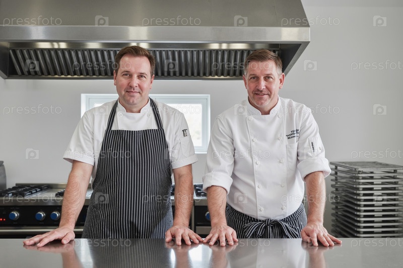 Два мужчины среднего возраста, стоящие на профессиональной кухне и улыбающиеся