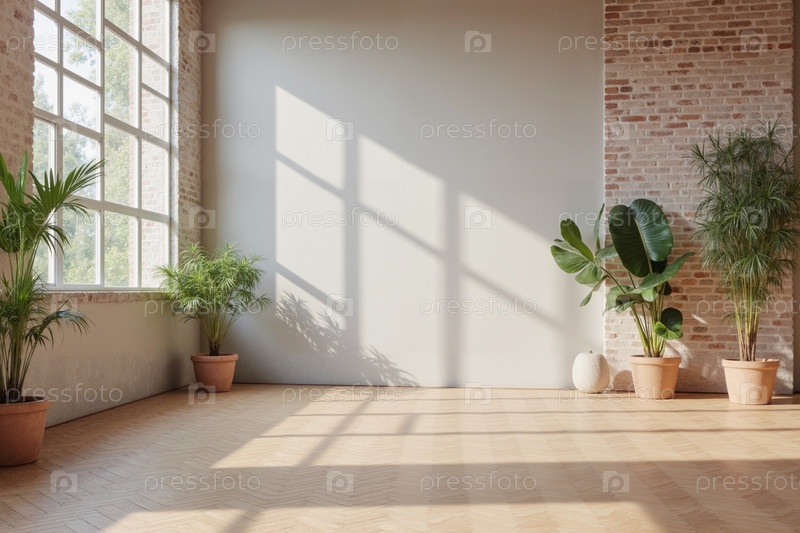 Солнечный свет течет через окно, освещая горшечные растения в современном лофте