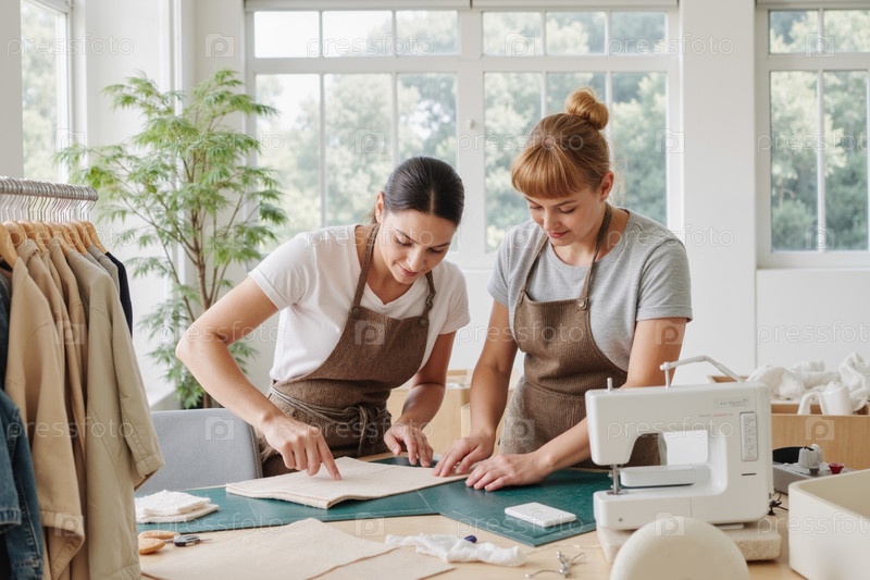 Две молодые взрослые женщины сотрудничают над проектом по пошиву в помещении