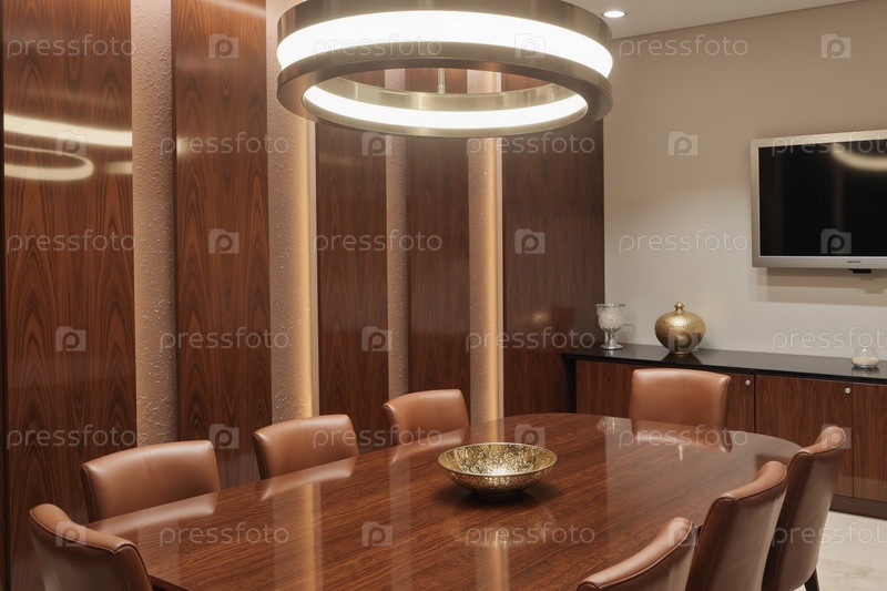 Пустой современный конференц-зал с деревянным столом и кожаными стульями