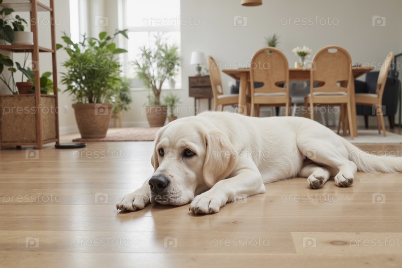 Лабрадор ретривер лежит на деревянном полу отдыхает в яркой современной гостиной