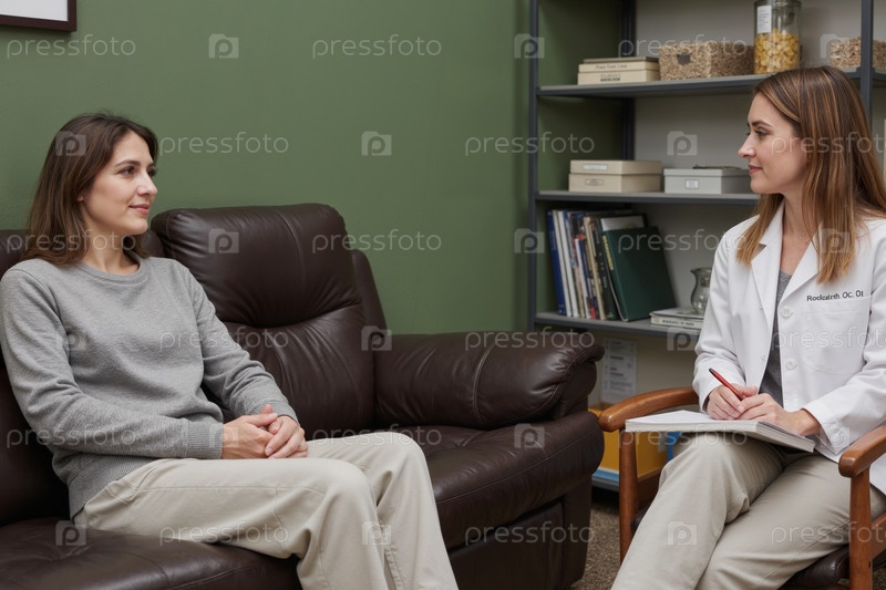 Молодая взрослая женщина консультирует женщину-врача во время сеанса терапии