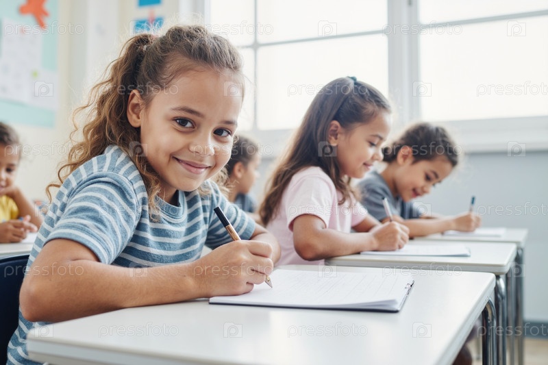Портрет улыбающейся девочки, пишущей в классе с различными детьми