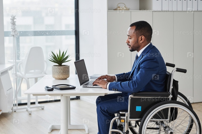 Молодой взрослый чернокожий мужчина в инвалидном кресле работает на ноутбуке в современном офисе