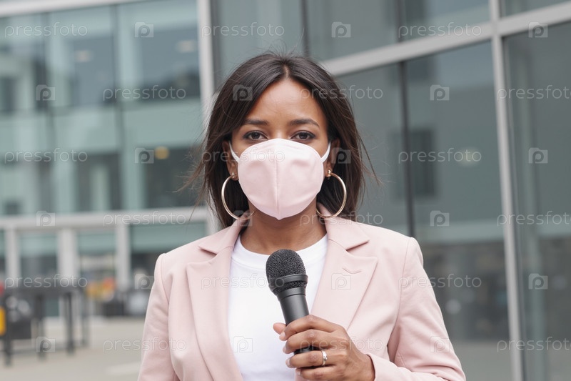 Портрет молодой взрослой чернокожей женщины, отчитывающейся о новостях на улице с маской