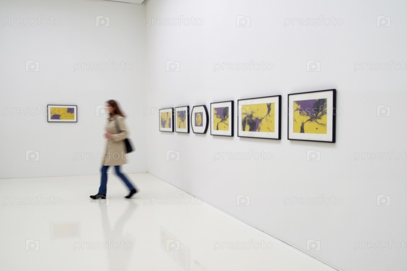 Молодая взрослая женщина наблюдает абстрактные произведения искусства в современной галерее
