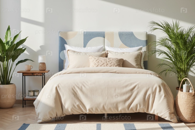 Современный интерьер спальни с уютной кроватью и декоративными комнатными растениями