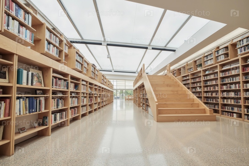 Пустой современный библиотечный интерьер с книжными полками и деревянной лестницей