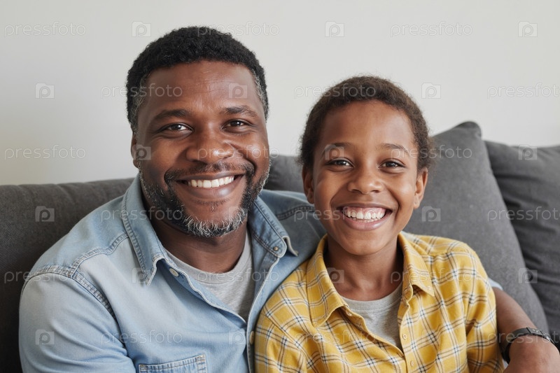 Портрет чернокожего мужчины средних лет и молодого чёрного мальчика, улыбающегося вместе