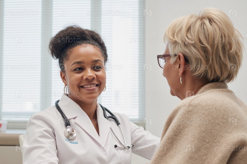 Молодой взрослый чернокожий врач-женщина улыбается, консультируя старшую женщину