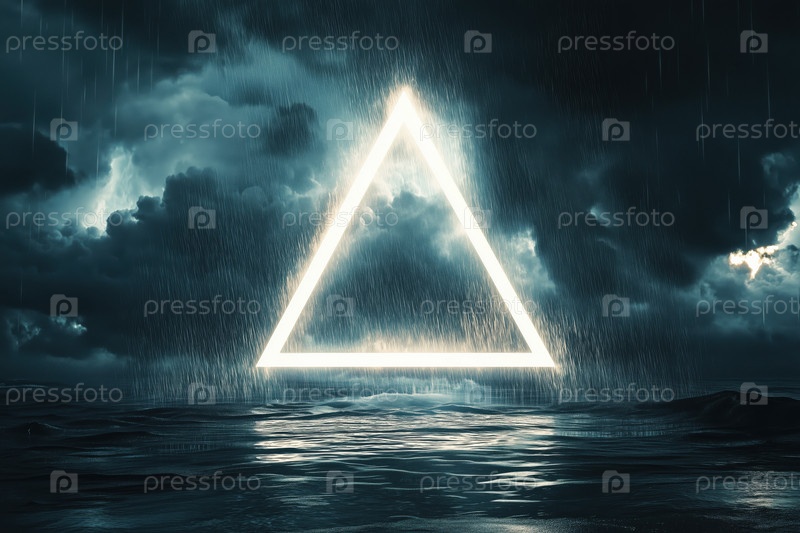 Светящийся треугольник плавает над поверхностью океана во время драматической дождевой бури