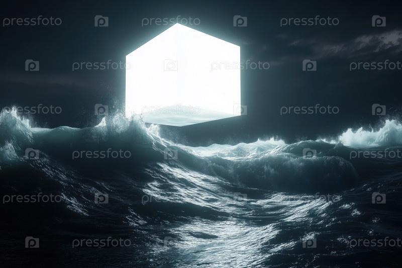 Светящийся геометрический куб, плавающий над бурными океанскими волнами ночью