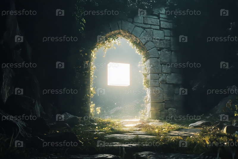 Древняя каменная арка, освещающая таинственный плавучий куб в лесу