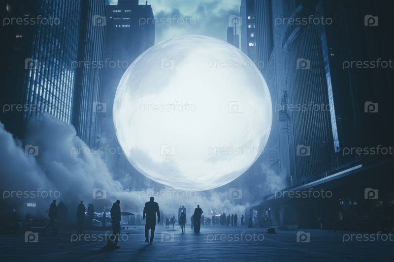 Силуэты людей, приближающихся к светящейся сфере в футуристической городской обстановке