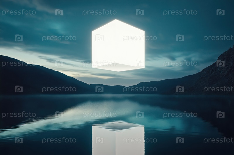 Светящийся геометрический куб, плавающий над Тихим озером на закате с горными отражениями