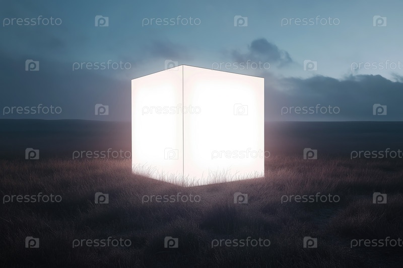 Светящийся куб, освещающий травянистое поле во время сумерек с таинственной атмосферой