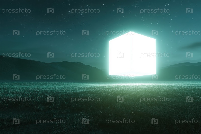 Светящийся футуристический куб, плавающий над травянистым полем под звездным ночным небом