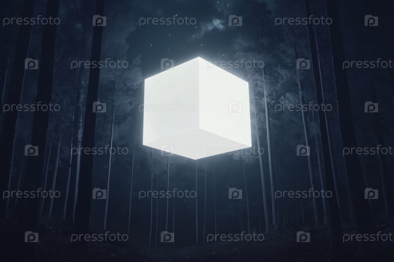 Светящийся геометрический куб, плавающий среди высоких деревьев в таинственную лесную ночь