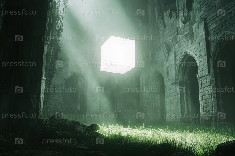 Светящийся куб, плавающий в заброшенных каменных руинах с драматическим солнечным светом