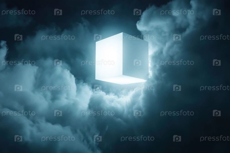 Светящийся геометрический куб, плавающий среди драматических темных облаков ночью