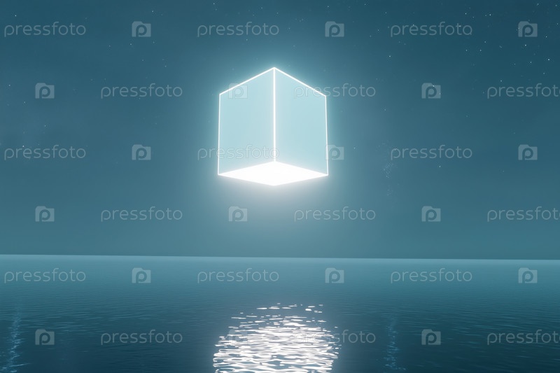 Светящийся футуристический куб, плавающий над спокойной поверхностью океана ночью