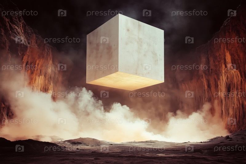 Большой геометрический куб, паривший над Скалистым каньоном в окружении восходящего тумана