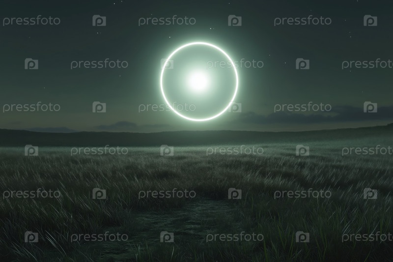 Светящийся круговой свет, паривший над травянистым полем ночью под звездным небом