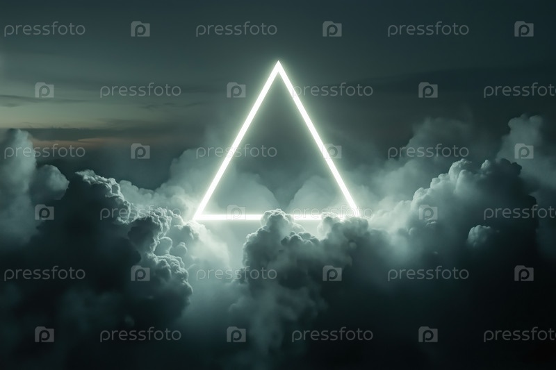 Светящийся геометрический треугольник плавает над драматическим облачным пейзажем на закате