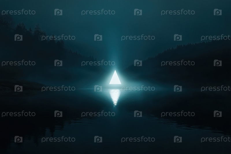 Светящийся геометрический треугольник, освещающий туманное озеро ночью В окружении леса