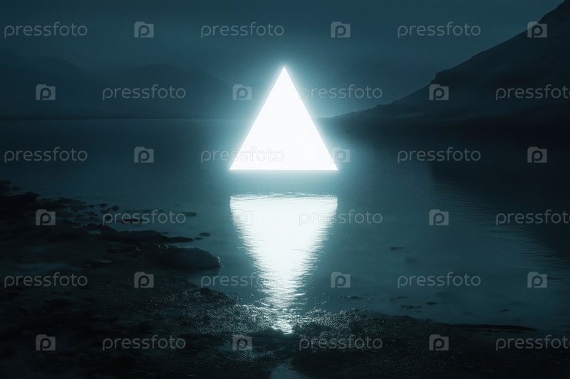Светящийся геометрический треугольник, освещающий туманное озеро ночью с отражением