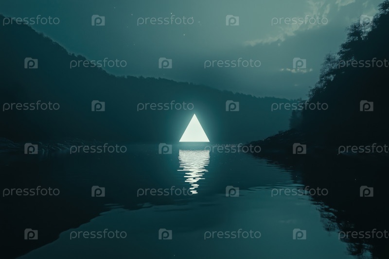 Светящаяся геометрическая форма, освещающая поверхность озера ночью Окруженная холмами