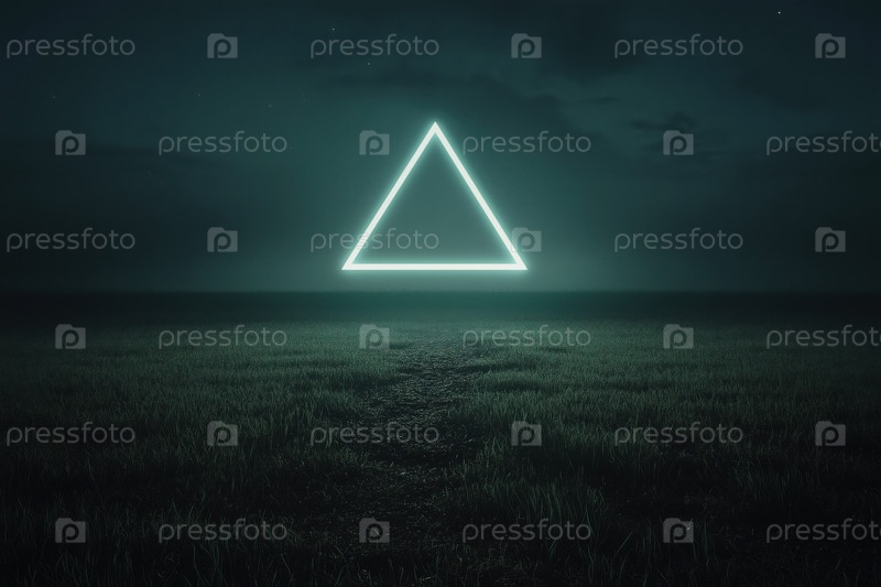 Светящийся неоновый треугольник плавает над травянистым полем ночью, создавая сюрреалистическую сцену