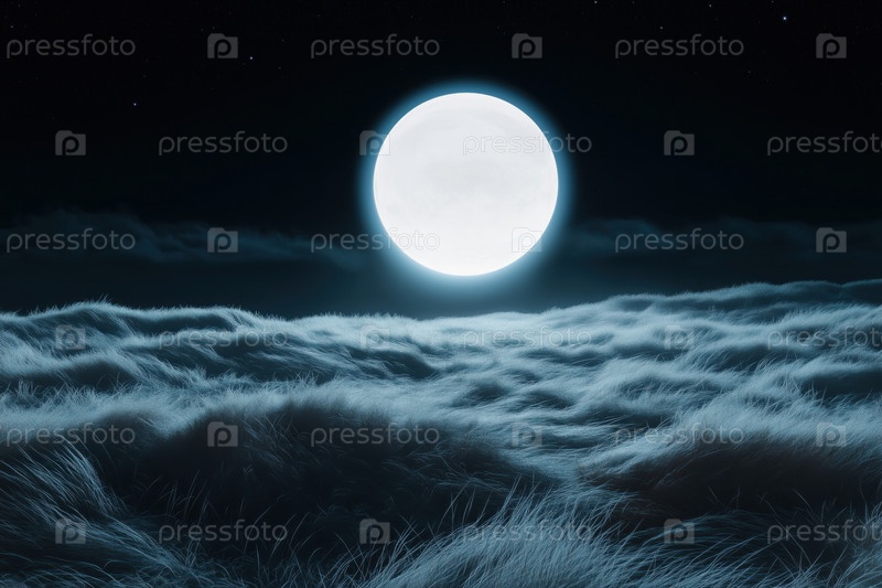 Полнолуние освещает сюрреалистический пейзаж с мягкими туманными волнами ночью