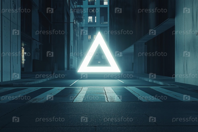 Светящийся геометрический треугольник, плавающий на пустой городской улице ночью