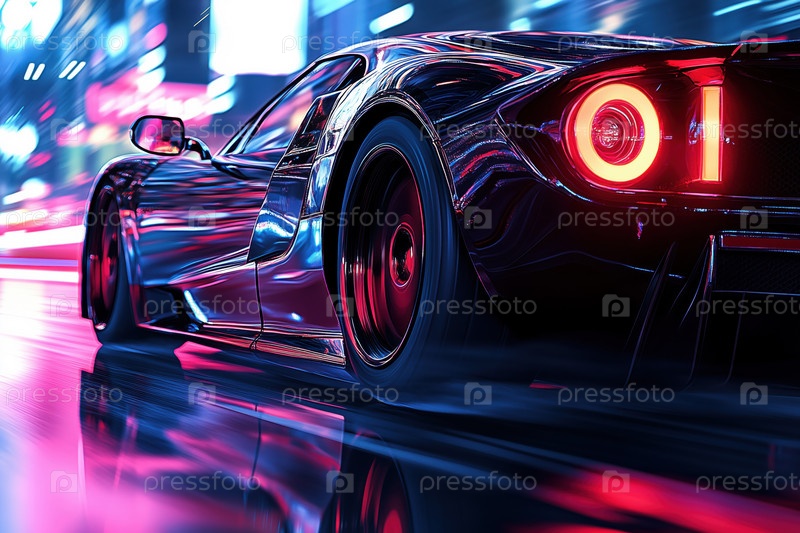 Спортивный автомобиль, движущийся на высокой скорости по улице Неон Сити ночью с Motion Blur